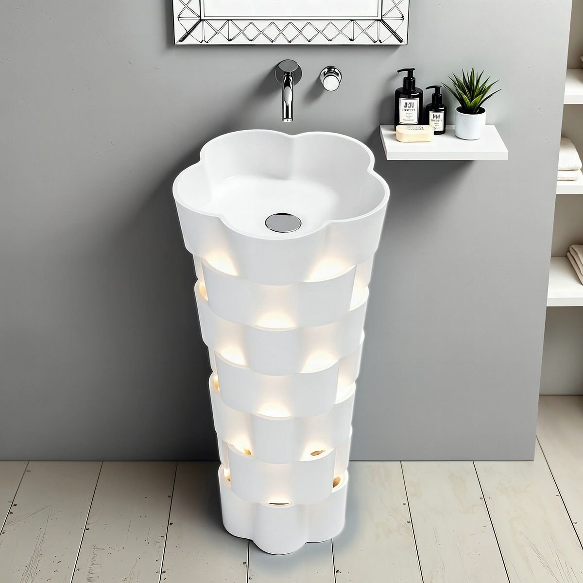 Seville White Stone Cloakroom Floor Standing Pedestal Basin Sink With Lights